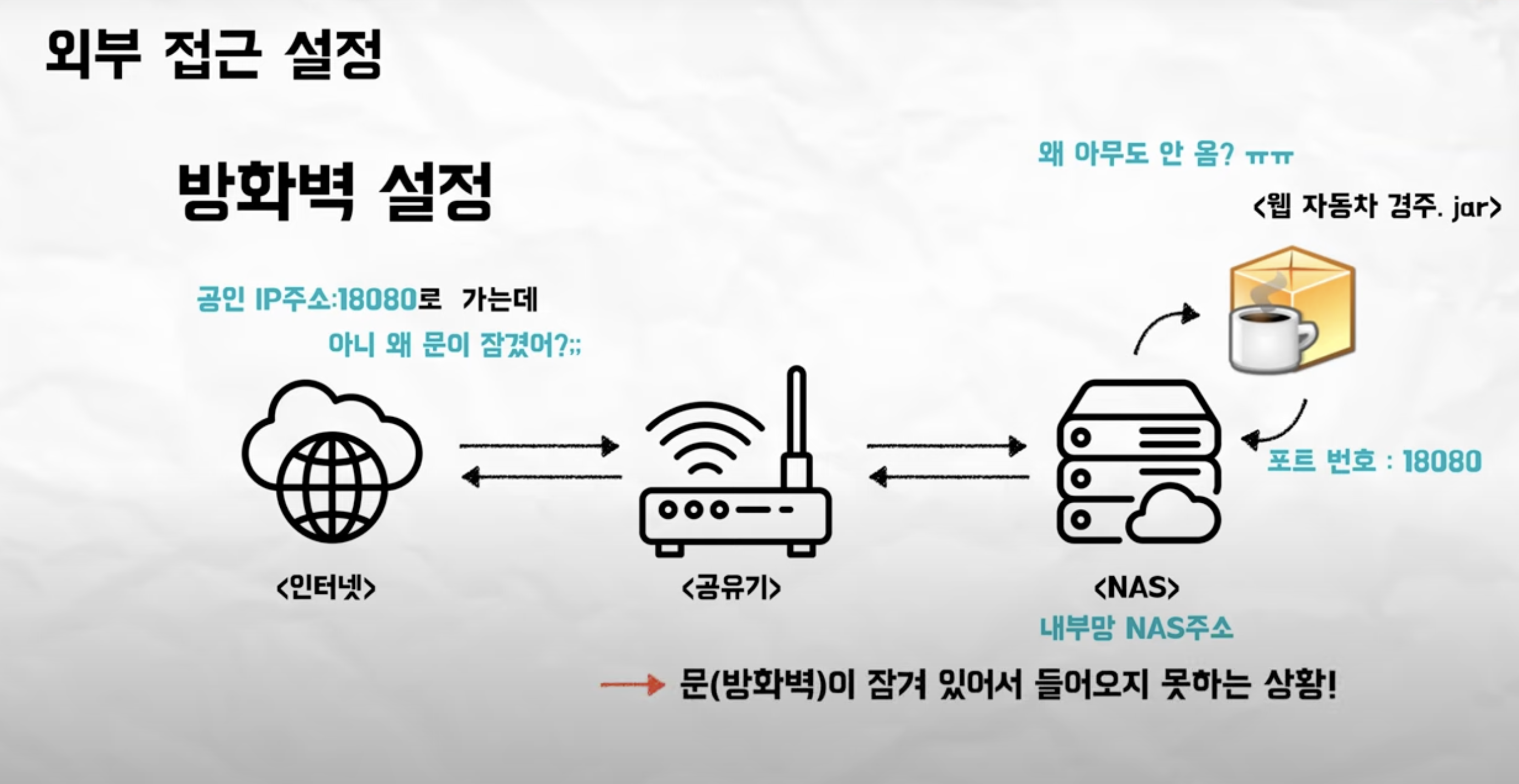외부에서 특정 포트로 접속하려면, 먼저 공유기의 방화벽에서 해당 포트로 들어오는 IP 주소를 허용하는 설정을 해야 합니다. 그런 다음, 공유기는 어떤 장비로 연결해야 할지 알지 못하므로 포트 포워딩 설정이 필요합니다. 포트 포워딩을 통해 외부에서 들어오는 특정 포트를 내부 서버의 대응 포트와 연결하는 규칙을 설정하여, 외부 IP에서 요청이 들어왔을 때 해당 서버로 트래픽을 전달할 수 있게 됩니다.